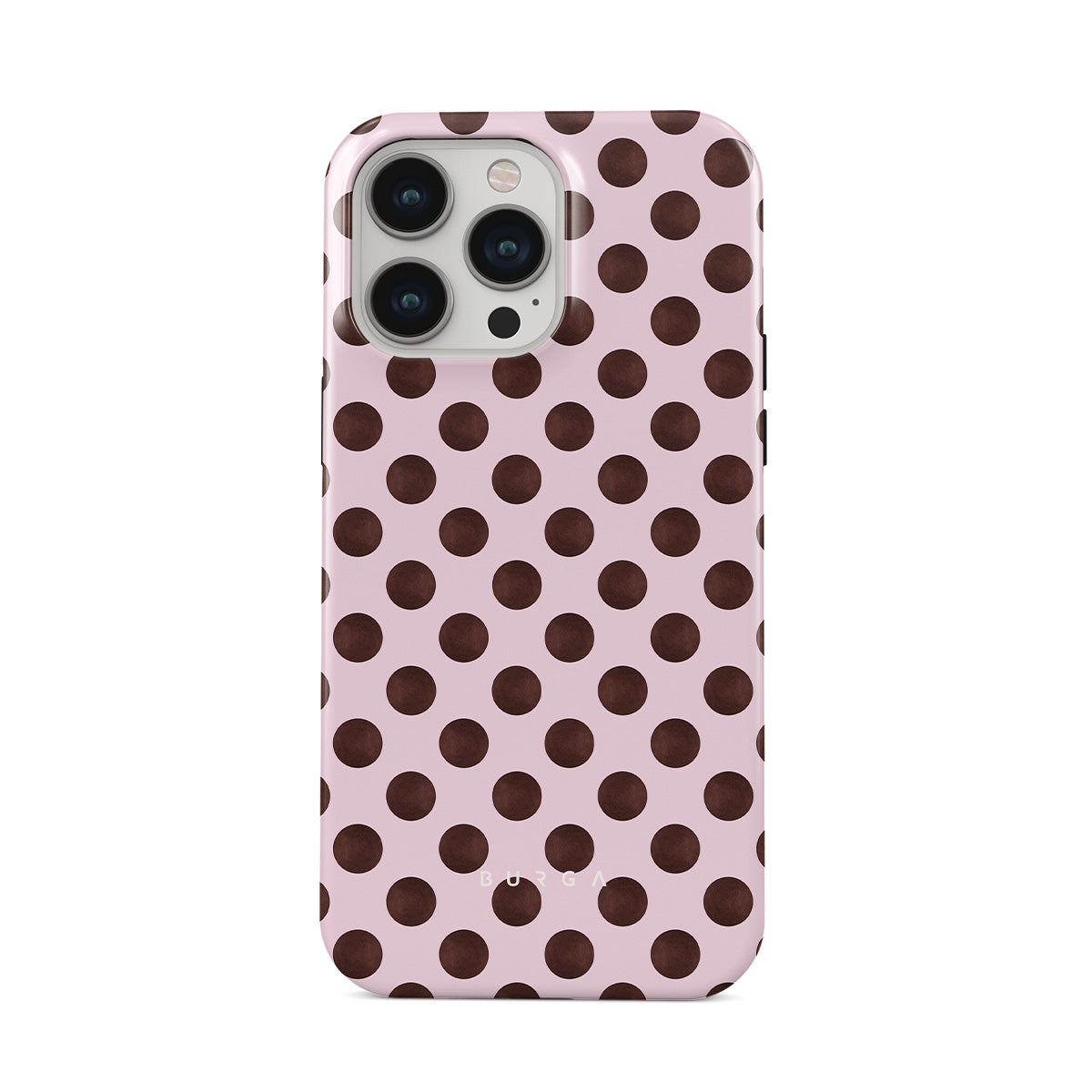 Questo design include: un motivo a pois retrò, sfondo rosa con pois marroni.