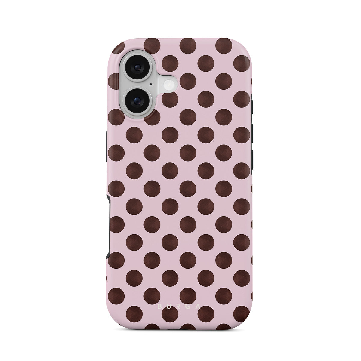 Questo design include: un motivo a pois retrò, sfondo rosa con pois marroni.