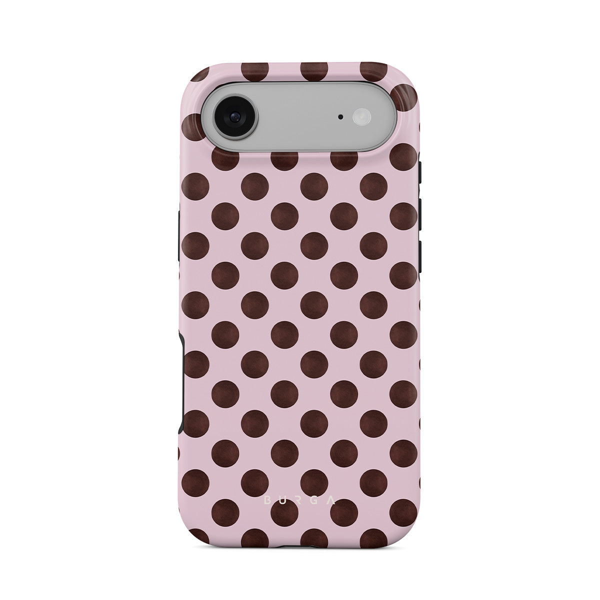 Questo design include: un motivo a pois retrò, sfondo rosa con pois marroni.