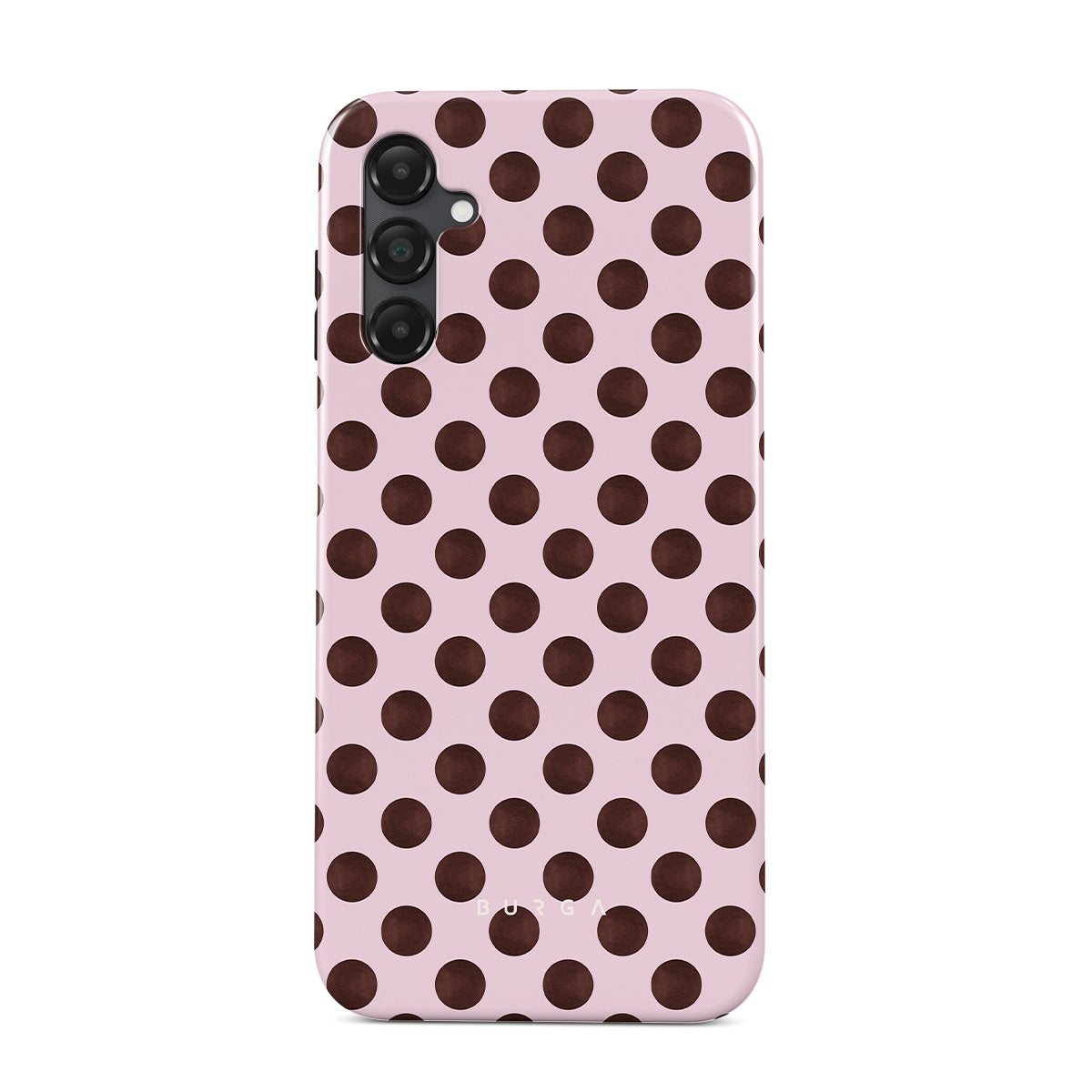 Questo design include: un motivo a pois retrò, sfondo rosa con pois marroni.