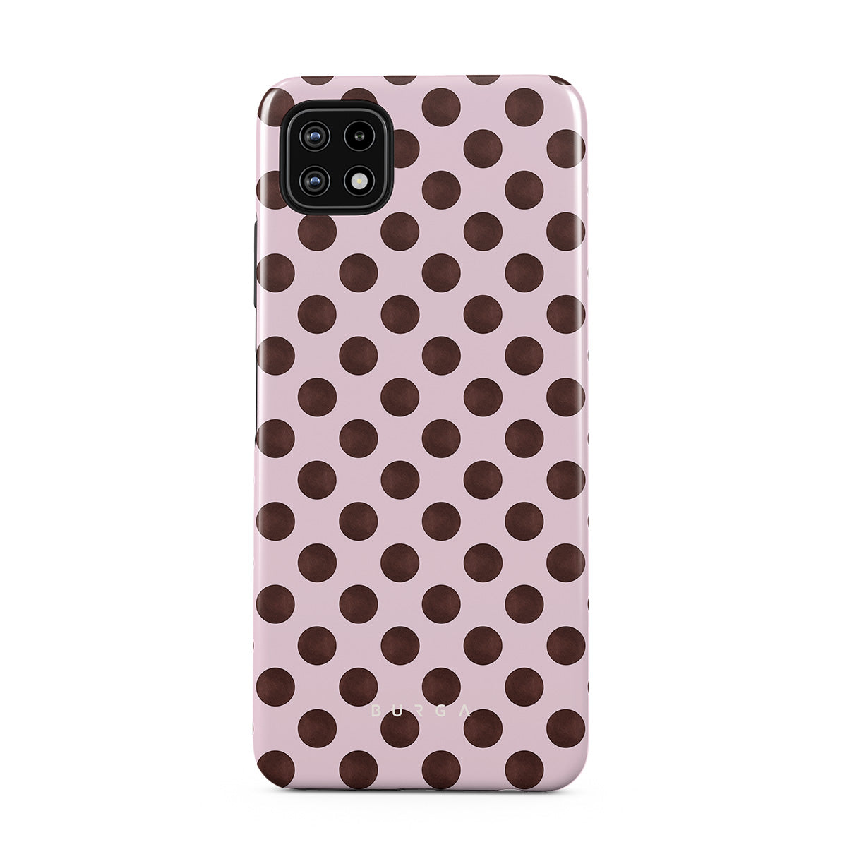 Questo design include: un motivo a pois retrò, sfondo rosa con pois marroni.