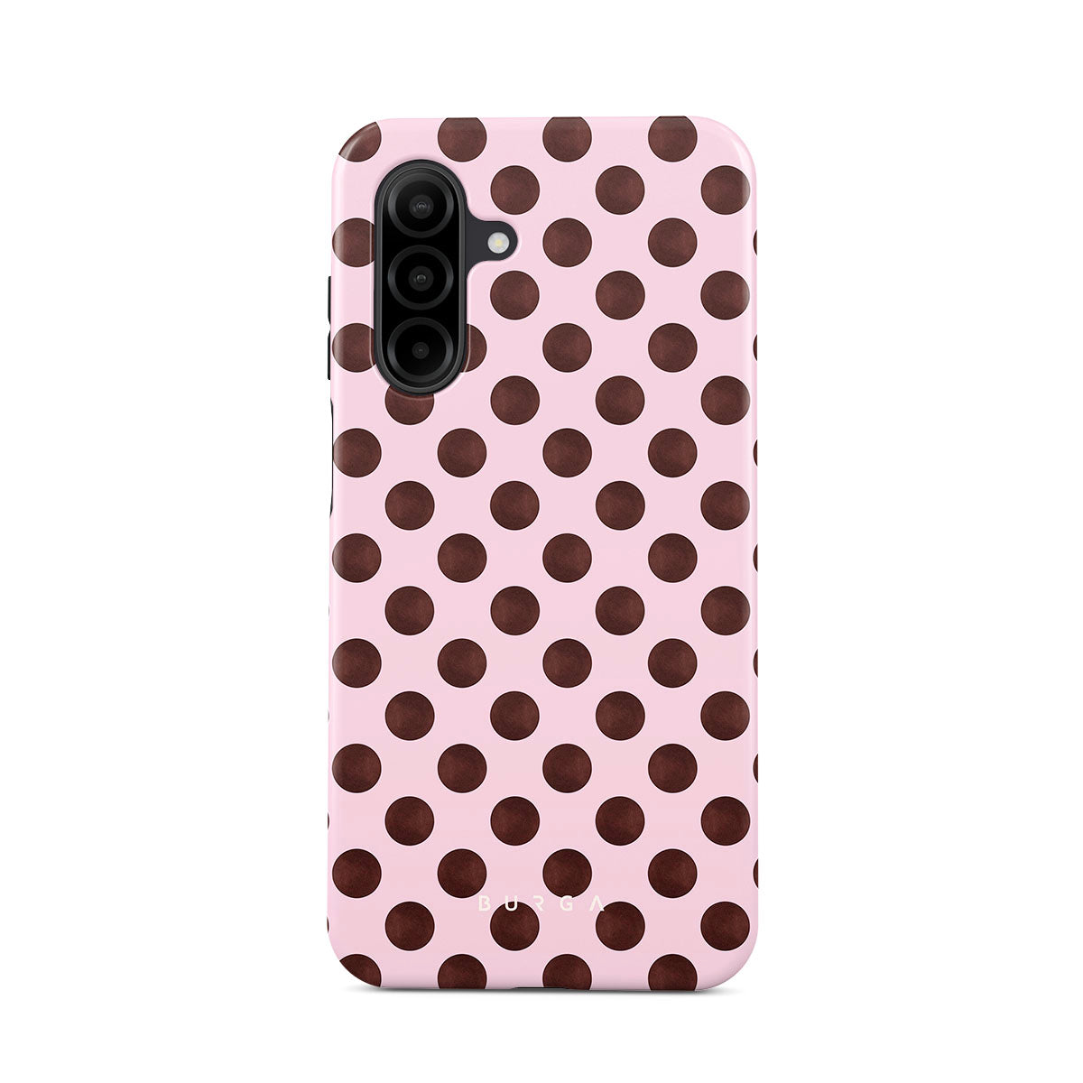 Questo design include: un motivo a pois retrò, sfondo rosa con pois marroni.
