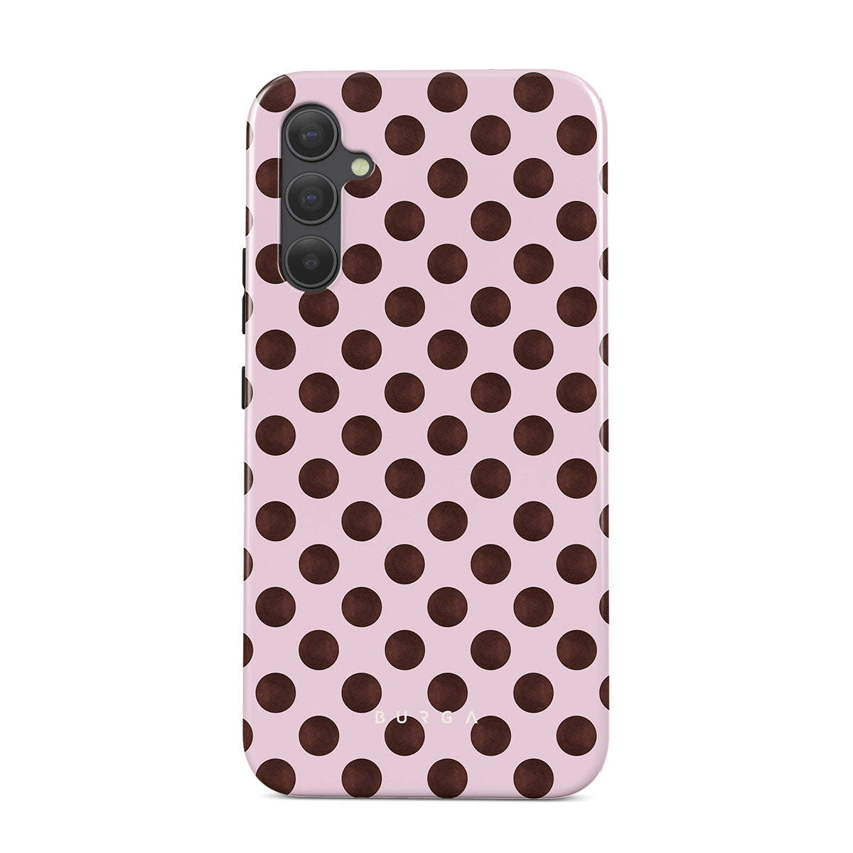 Questo design include: un motivo a pois retrò, sfondo rosa con pois marroni.