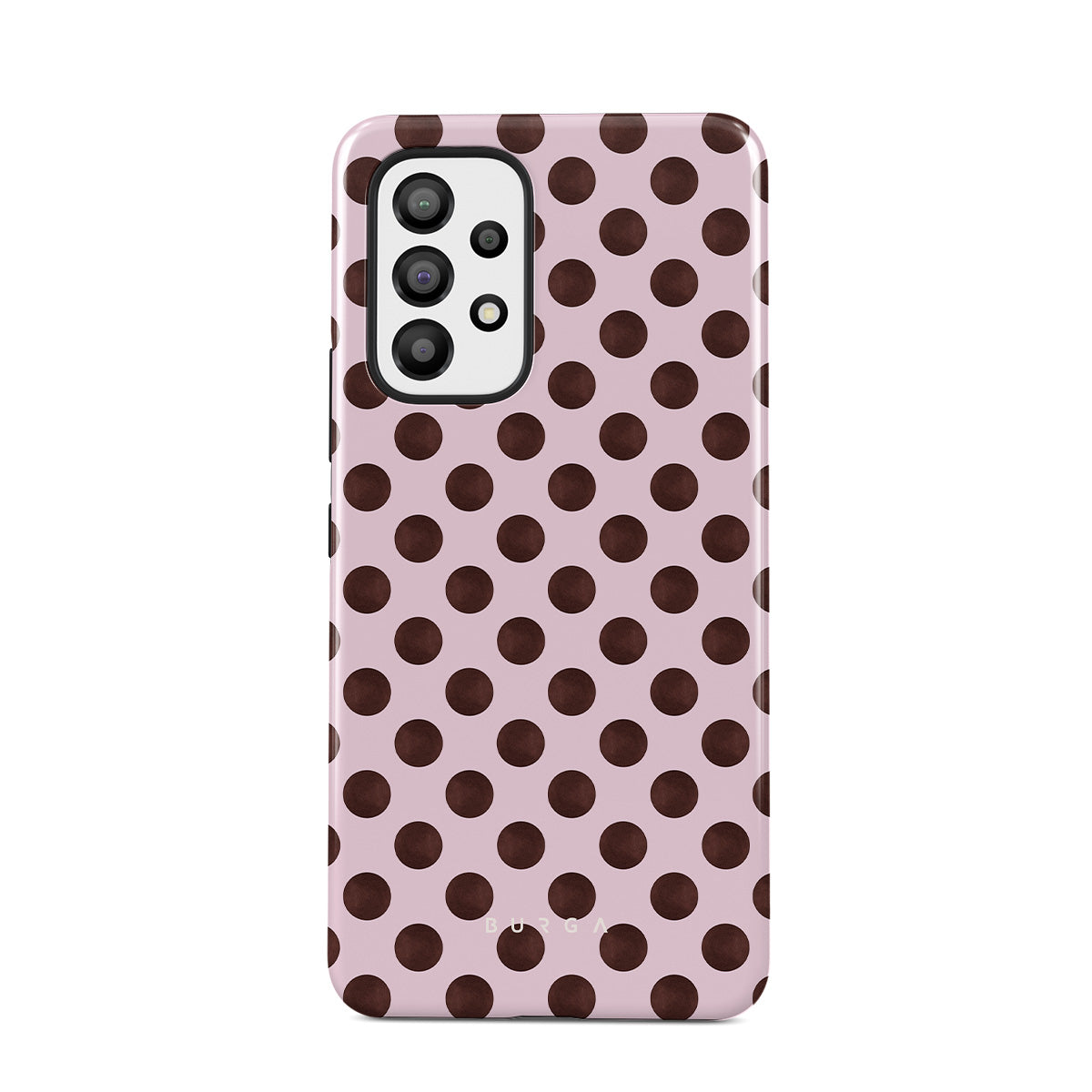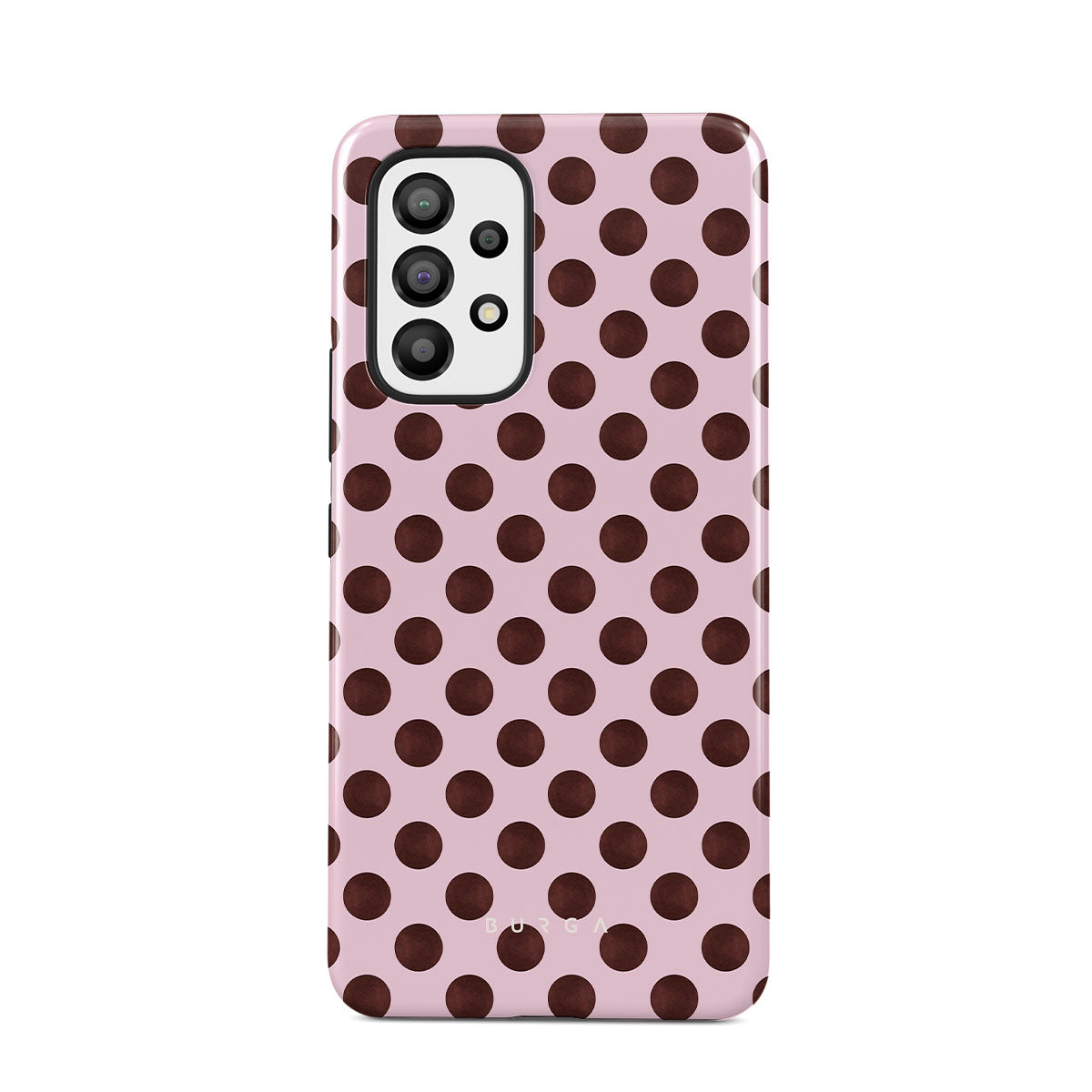 Questo design include: un motivo a pois retrò, sfondo rosa con pois marroni.