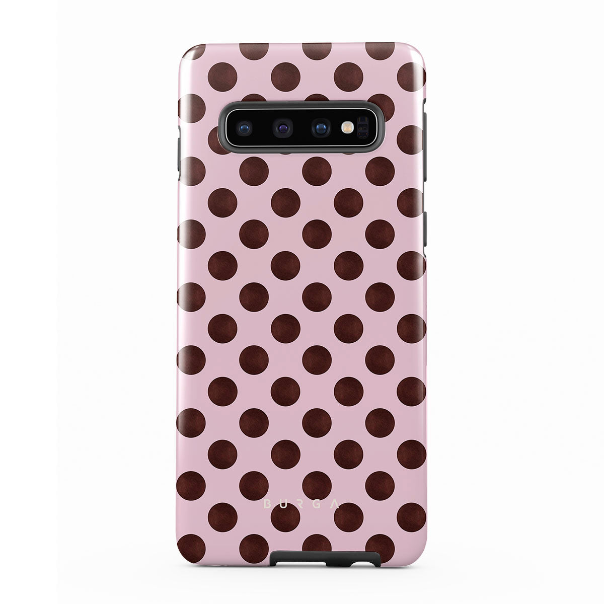 Questo design include: un motivo a pois retrò, sfondo rosa con pois marroni.