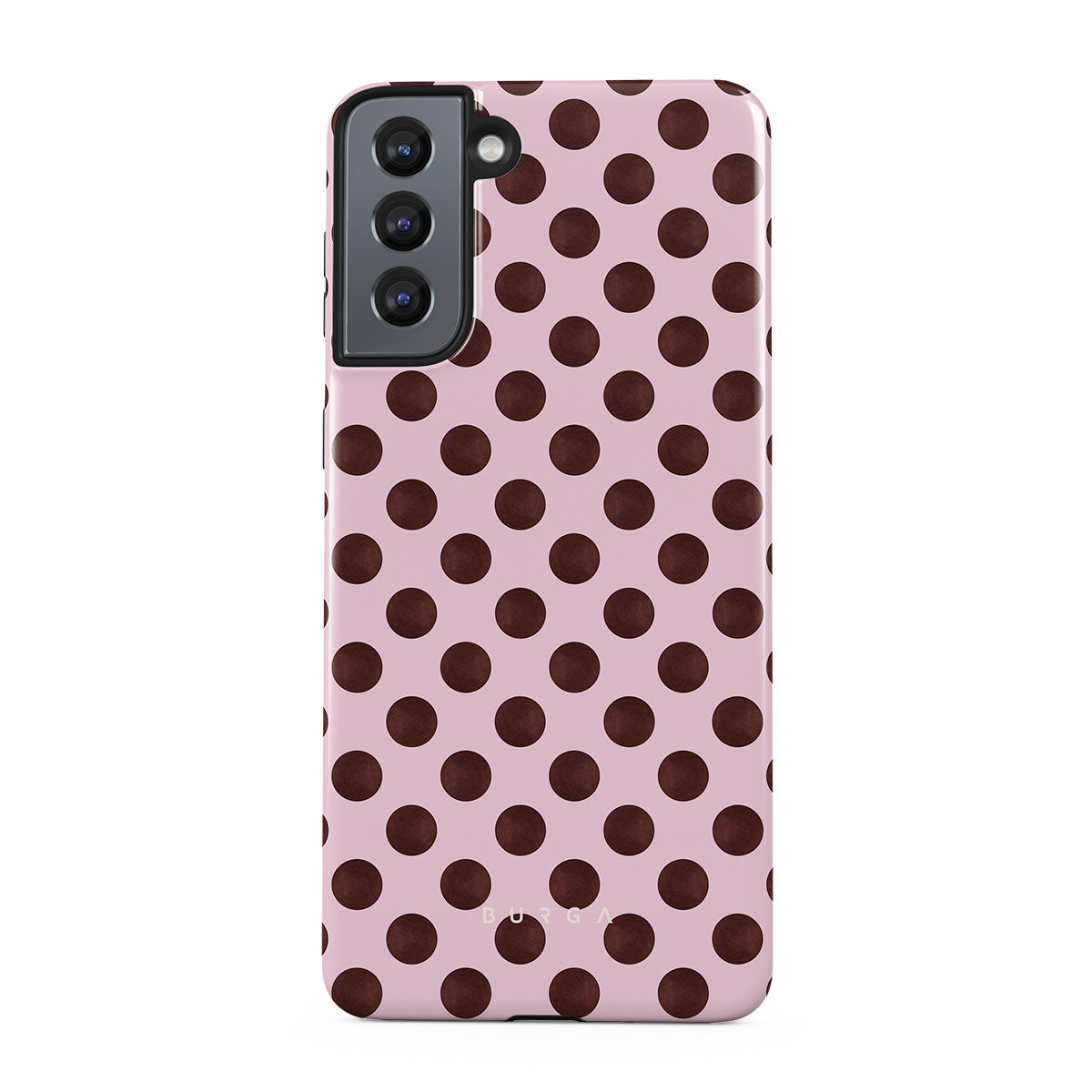 Questo design include: un motivo a pois retrò, sfondo rosa con pois marroni.