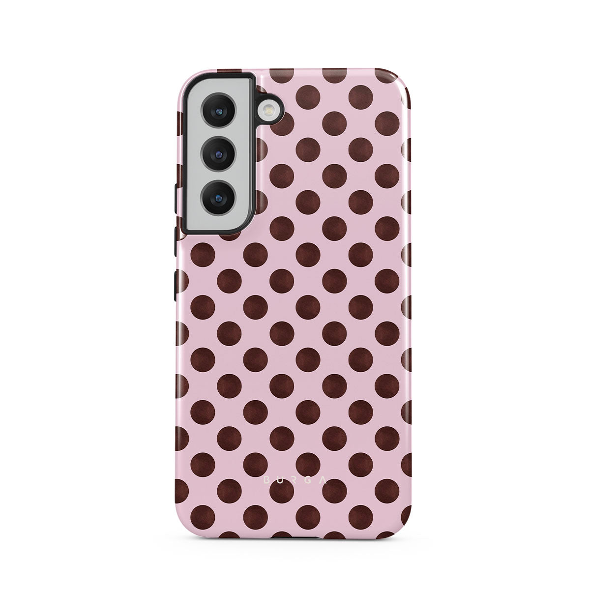 Questo design include: un motivo a pois retrò, sfondo rosa con pois marroni.