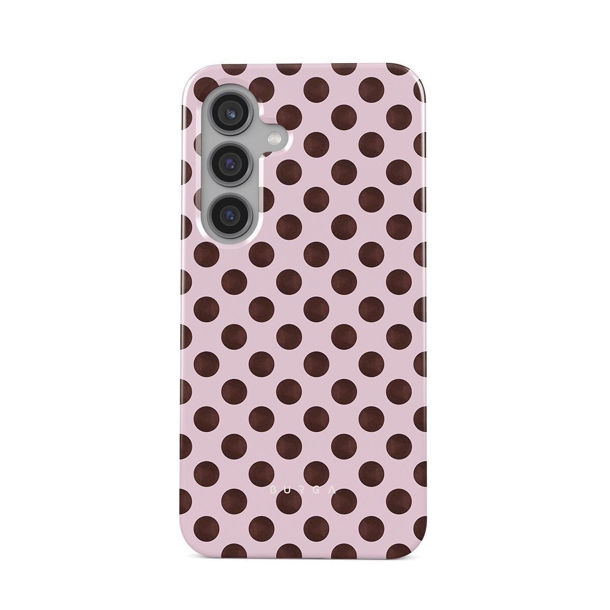 Questo design include: un motivo a pois retrò, sfondo rosa con pois marroni.
