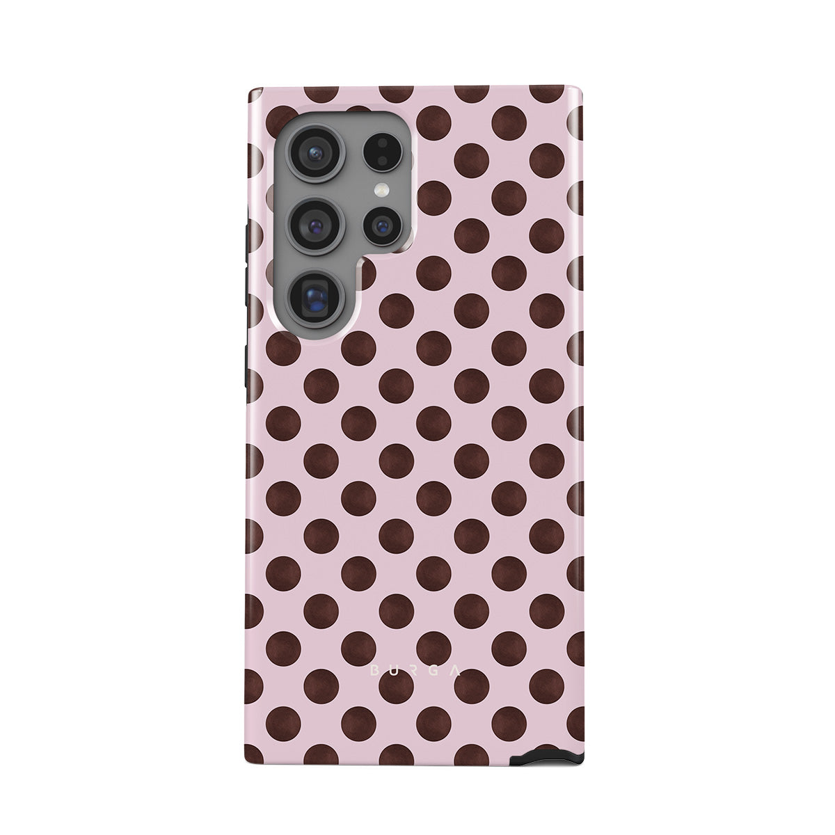 Questo design include: un motivo a pois retrò, sfondo rosa con pois marroni.