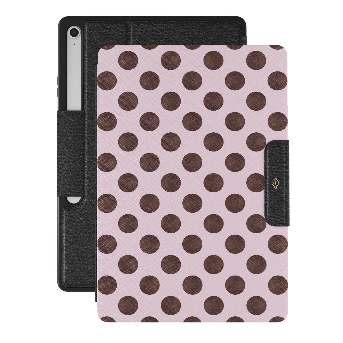 Questo design include: un motivo a pois retrò, sfondo rosa con pois marroni.