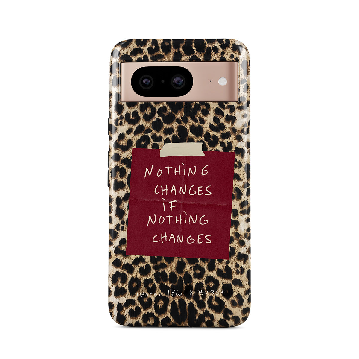 Questo design include: testo in corsivo, citazione, post-it rosso, stampa animalier