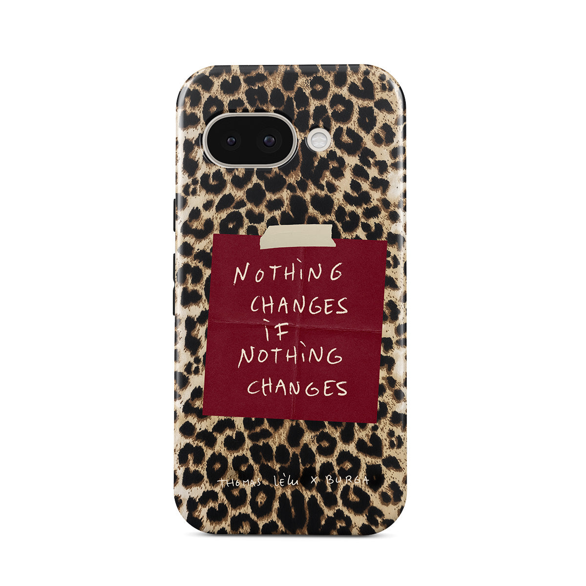 Questo design include: testo in corsivo, citazione, post-it rosso, stampa animalier