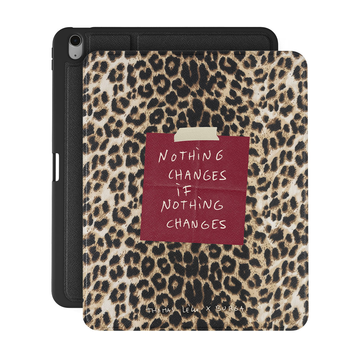 Questo design include: testo in corsivo, citazione, post-it rosso, stampa animalier