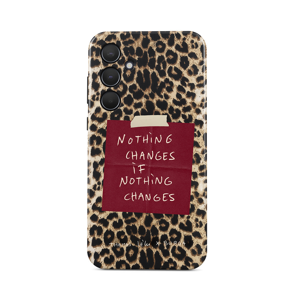 Questo design include: testo in corsivo, citazione, post-it rosso, stampa animalier