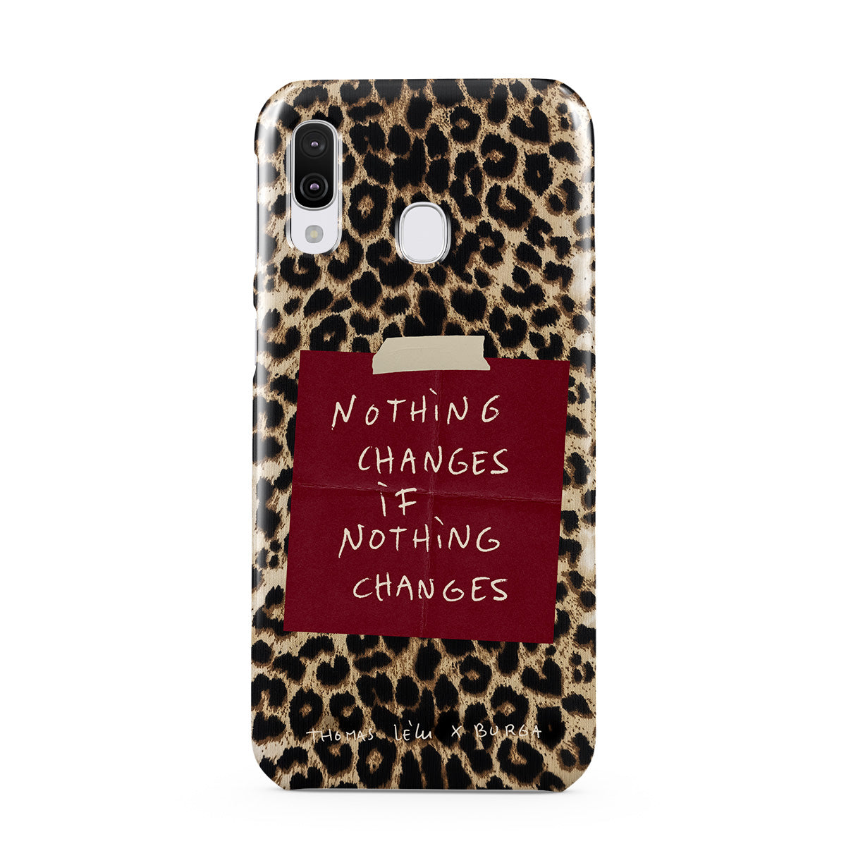 Questo design include: testo in corsivo, citazione, post-it rosso, stampa animalier