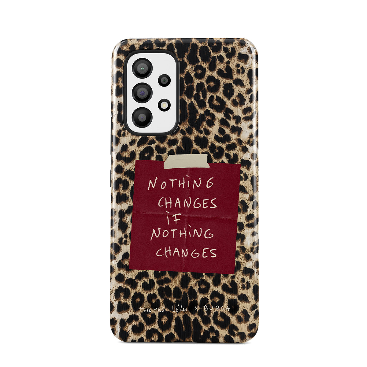 Questo design include: testo in corsivo, citazione, post-it rosso, stampa animalier