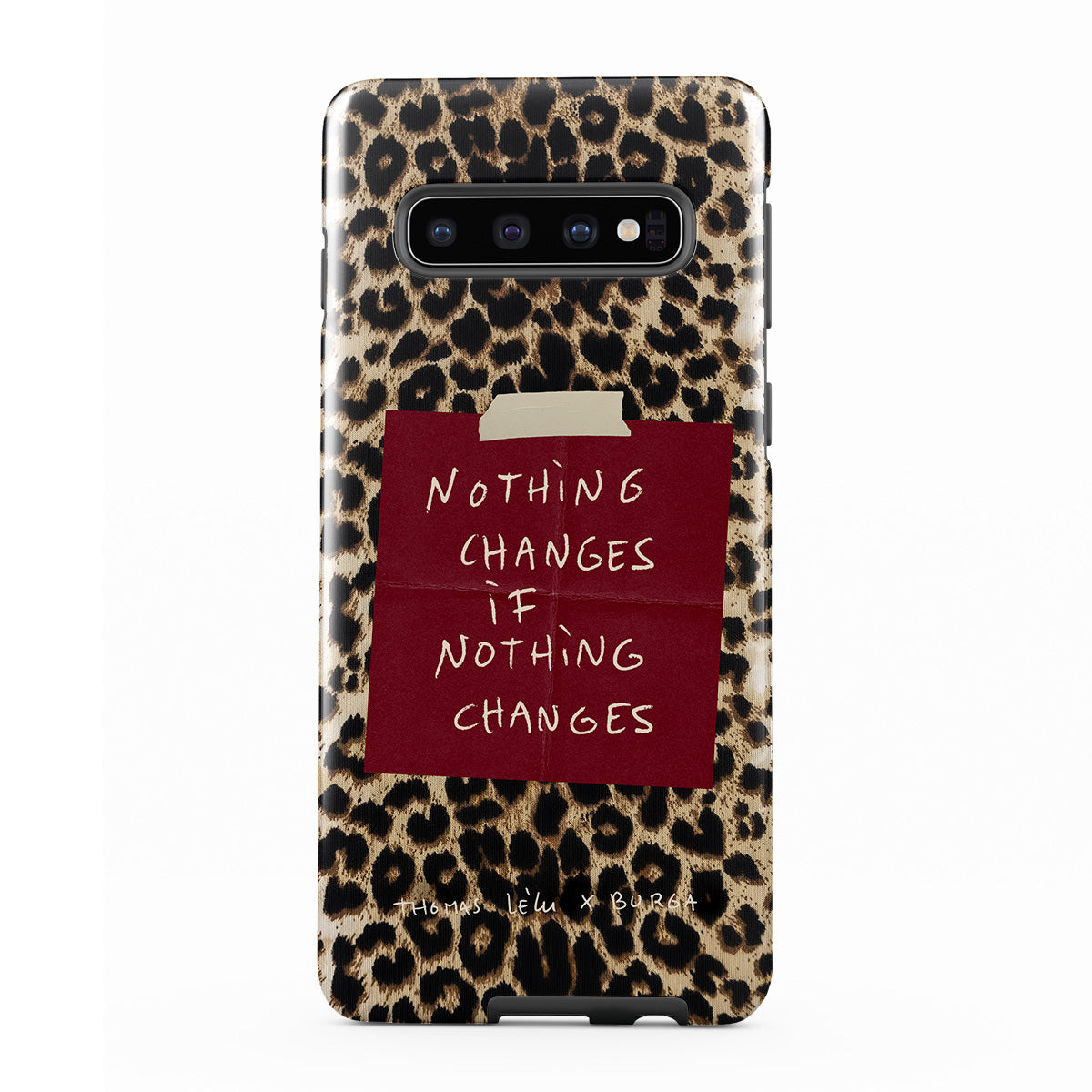 Questo design include: testo in corsivo, citazione, post-it rosso, stampa animalier