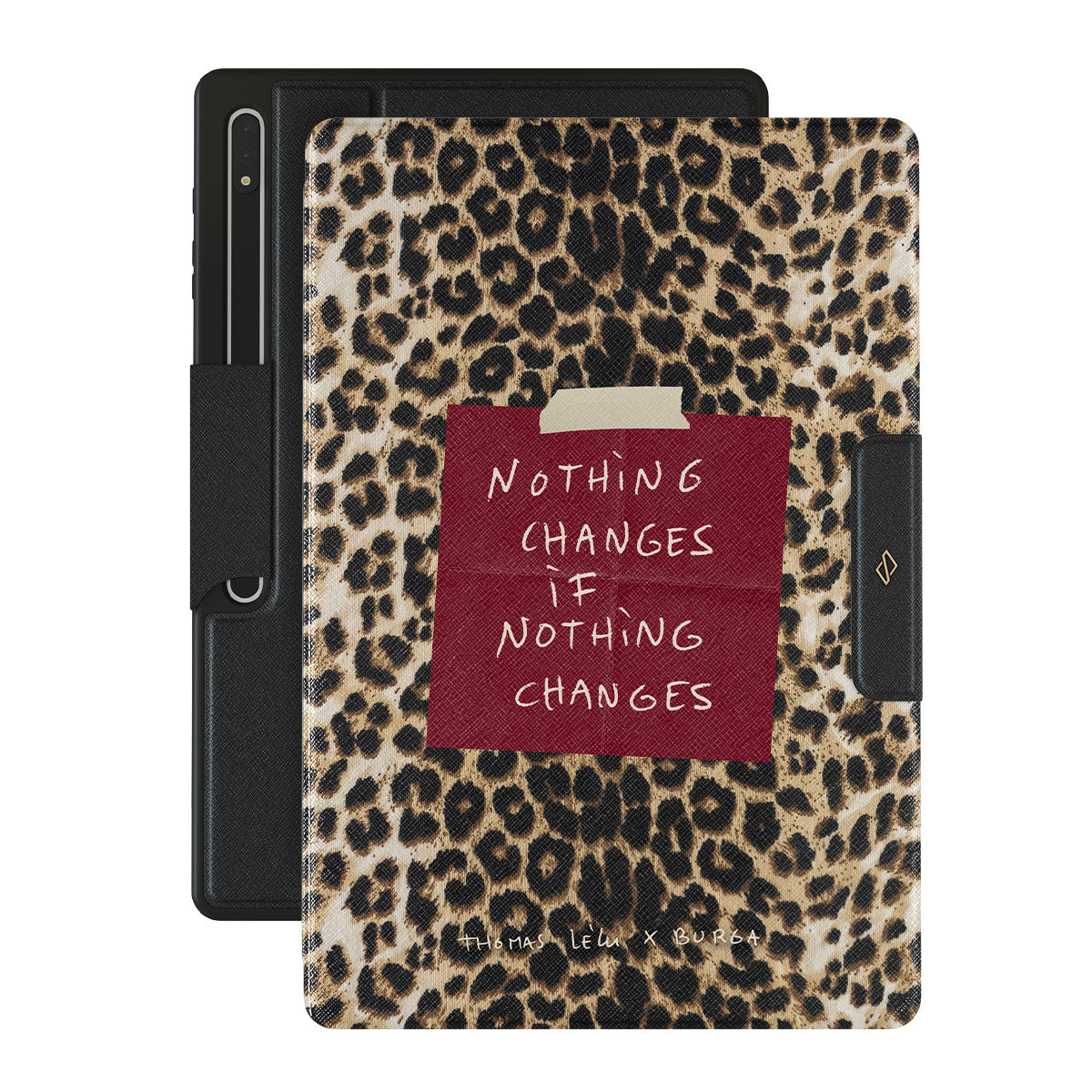 Questo design include: testo in corsivo, citazione, post-it rosso, stampa animalier