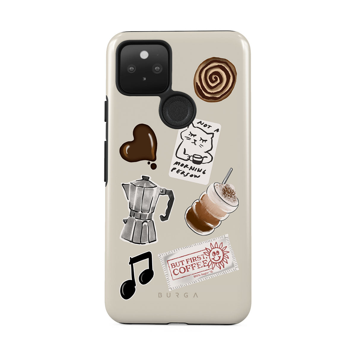 Questo design include: moka, frappè, rotolo alla cannella, cuore di cioccolato, sticker "Not a morning person", scontrino "But First, Coffee", nota musicale.