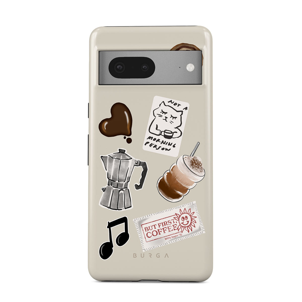Questo design include: moka, frappè, rotolo alla cannella, cuore di cioccolato, sticker "Not a morning person", scontrino "But First, Coffee", nota musicale.