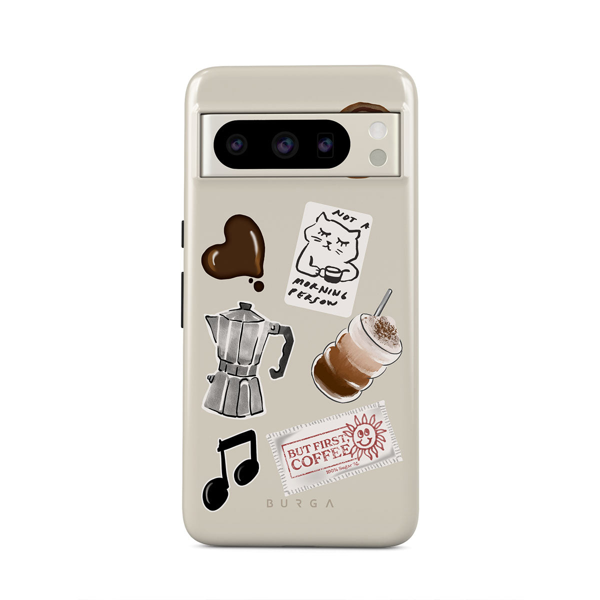 Questo design include: moka, frappè, rotolo alla cannella, cuore di cioccolato, sticker "Not a morning person", scontrino "But First, Coffee", nota musicale.