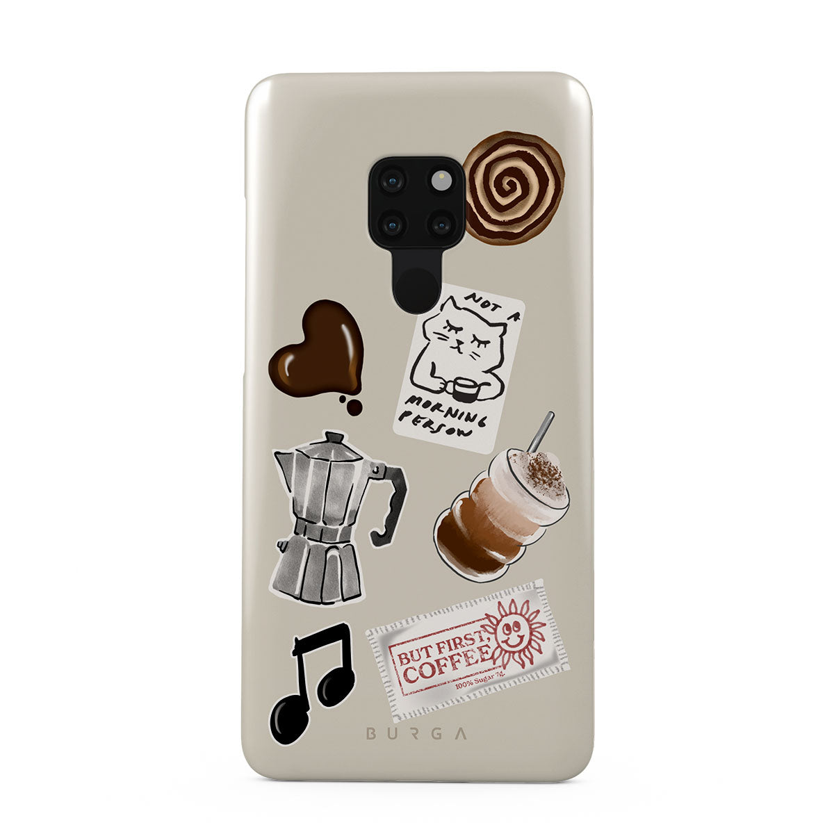 Questo design include: moka, frappè, rotolo alla cannella, cuore di cioccolato, sticker "Not a morning person", scontrino "But First, Coffee", nota musicale.