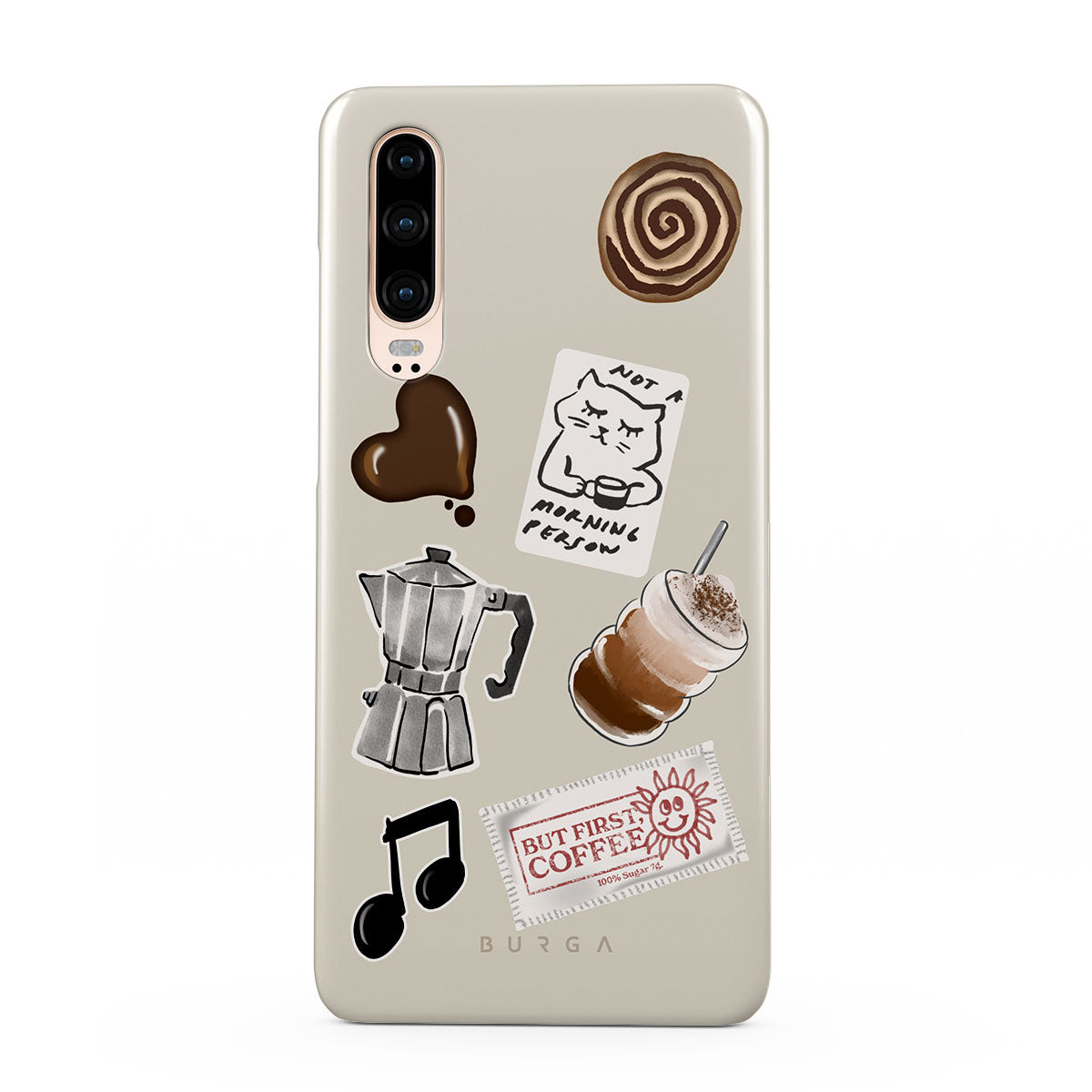 Questo design include: moka, frappè, rotolo alla cannella, cuore di cioccolato, sticker "Not a morning person", scontrino "But First, Coffee", nota musicale.