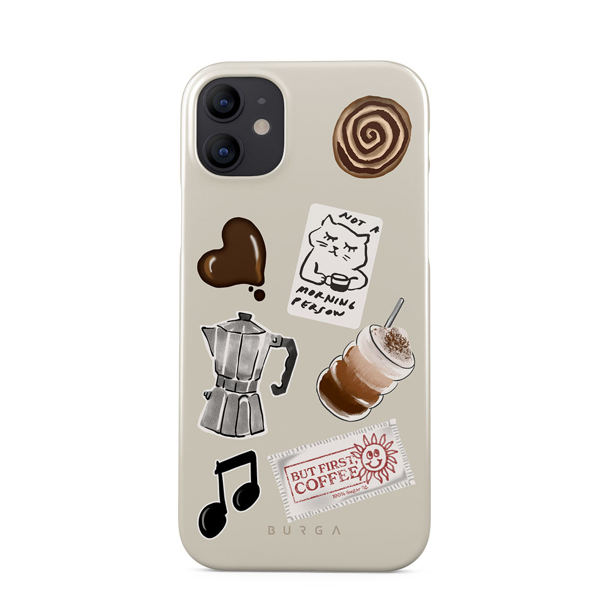 Questo design include: moka, frappè, rotolo alla cannella, cuore di cioccolato, sticker "Not a morning person", scontrino "But First, Coffee", nota musicale.