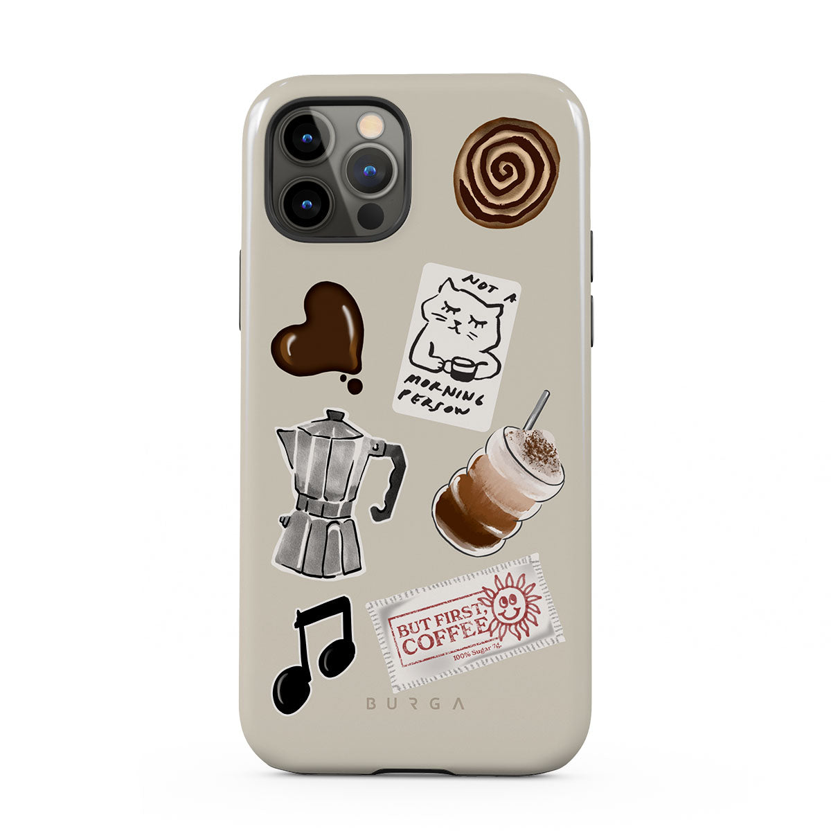 Questo design include: moka, frappè, rotolo alla cannella, cuore di cioccolato, sticker "Not a morning person", scontrino "But First, Coffee", nota musicale.