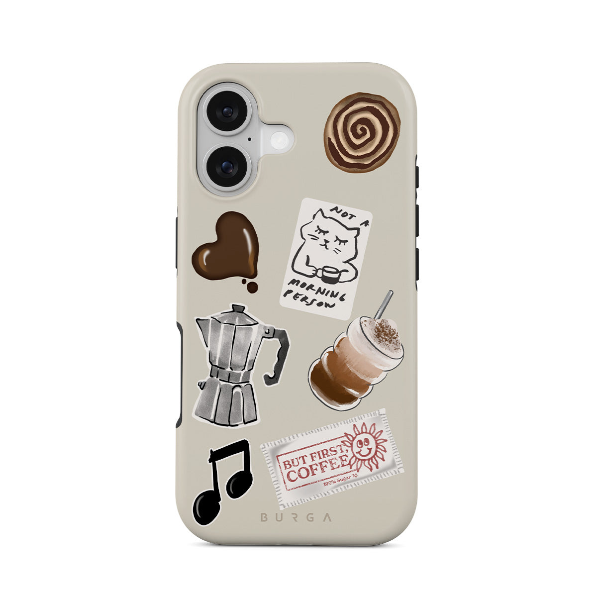 Questo design include: moka, frappè, rotolo alla cannella, cuore di cioccolato, sticker "Not a morning person", scontrino "But First, Coffee", nota musicale.