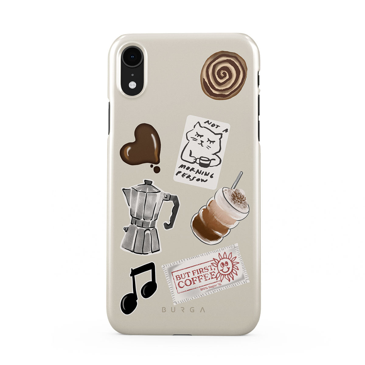 Questo design include: moka, frappè, rotolo alla cannella, cuore di cioccolato, sticker "Not a morning person", scontrino "But First, Coffee", nota musicale.