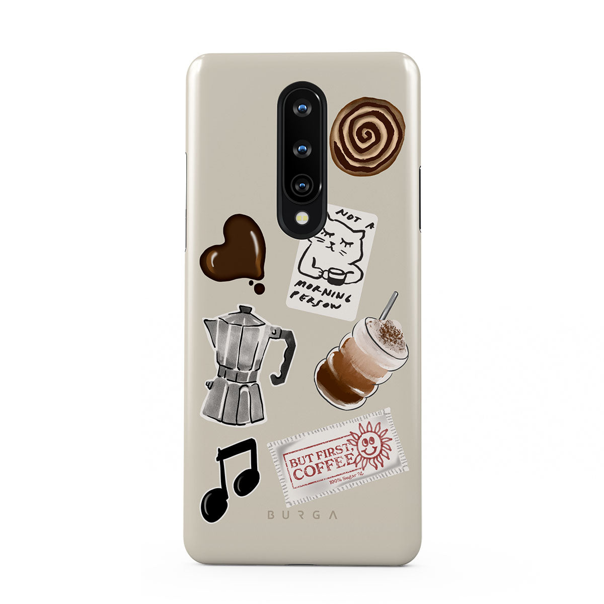 Questo design include: moka, frappè, rotolo alla cannella, cuore di cioccolato, sticker "Not a morning person", scontrino "But First, Coffee", nota musicale.