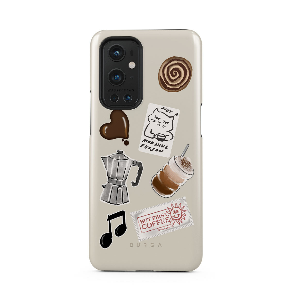 Questo design include: moka, frappè, rotolo alla cannella, cuore di cioccolato, sticker "Not a morning person", scontrino "But First, Coffee", nota musicale.
