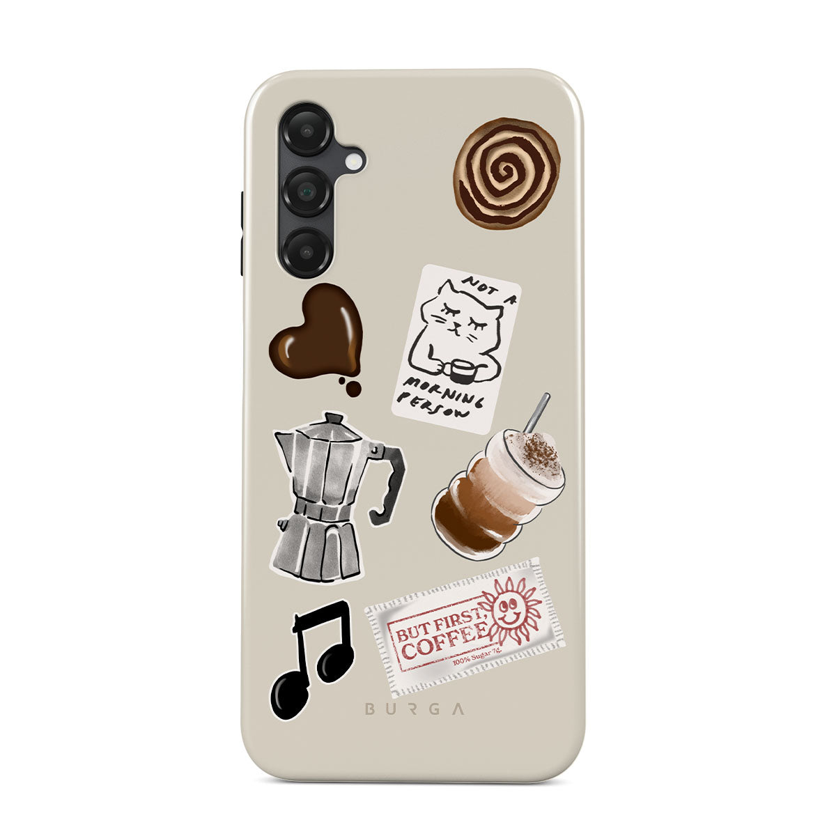 Questo design include: moka, frappè, rotolo alla cannella, cuore di cioccolato, sticker "Not a morning person", scontrino "But First, Coffee", nota musicale.