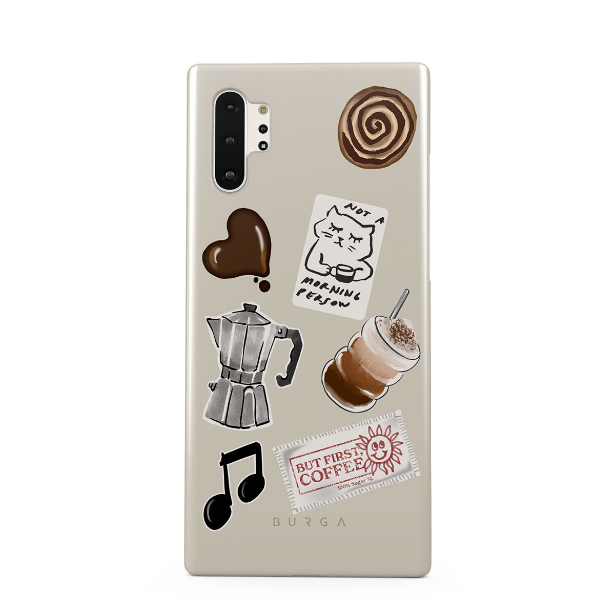 Questo design include: moka, frappè, rotolo alla cannella, cuore di cioccolato, sticker "Not a morning person", scontrino "But First, Coffee", nota musicale.