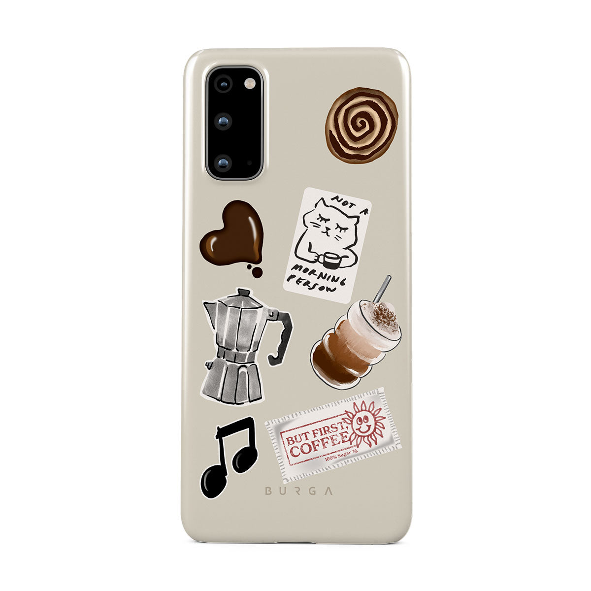 Questo design include: moka, frappè, rotolo alla cannella, cuore di cioccolato, sticker "Not a morning person", scontrino "But First, Coffee", nota musicale.