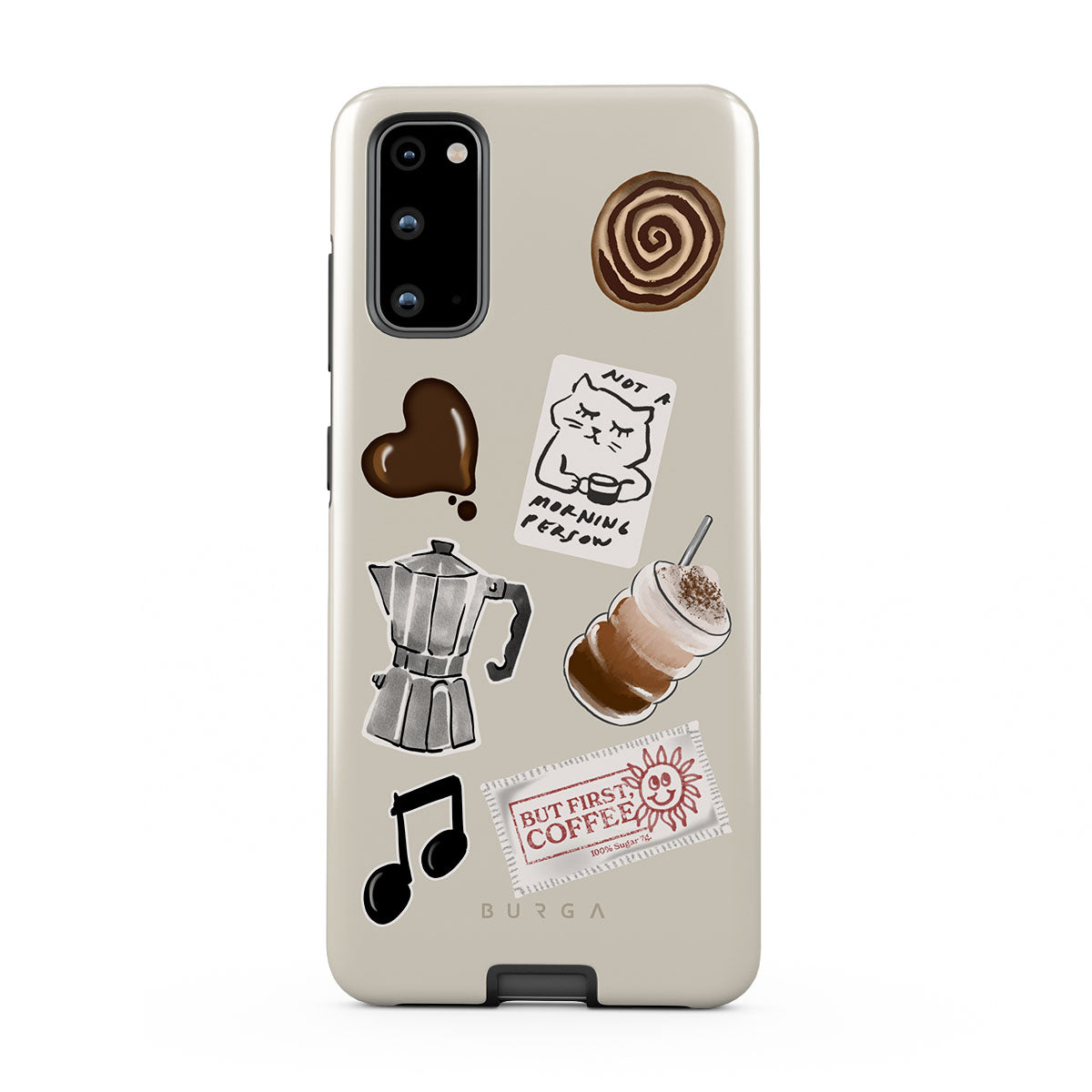 Questo design include: moka, frappè, rotolo alla cannella, cuore di cioccolato, sticker "Not a morning person", scontrino "But First, Coffee", nota musicale.