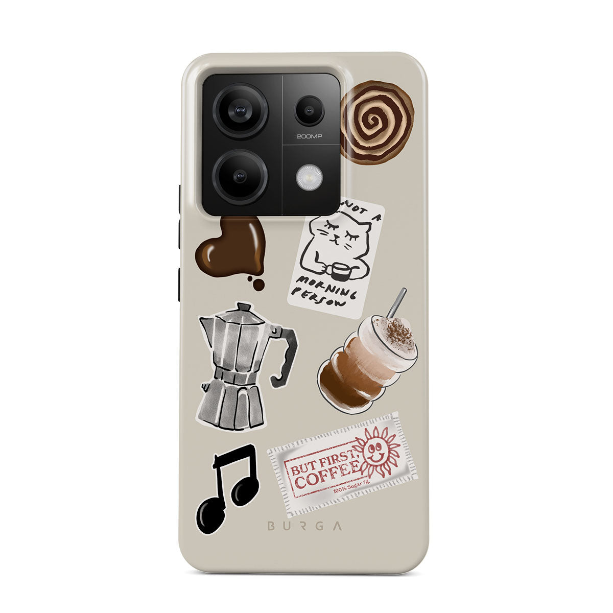 Questo design include: moka, frappè, rotolo alla cannella, cuore di cioccolato, sticker "Not a morning person", scontrino "But First, Coffee", nota musicale.