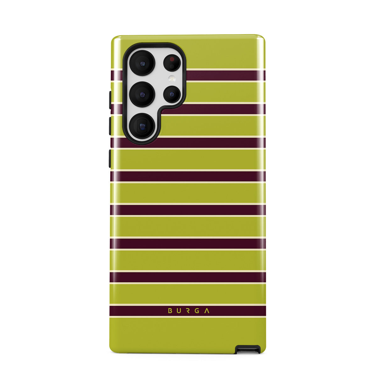 Questo design include: spesse righe orizzontali in verde lime e bordeaux.