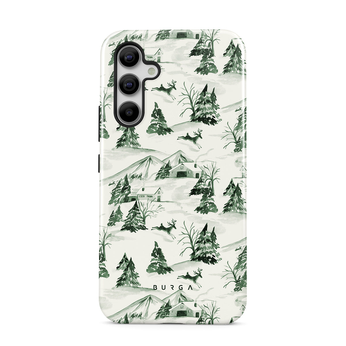 Questo design include: scena di foresta invernale, pini, paesaggio innevato, verde e bianco, motivo naturale, Natale nel bosco, alberi sempreverdi, illustrazione vintage