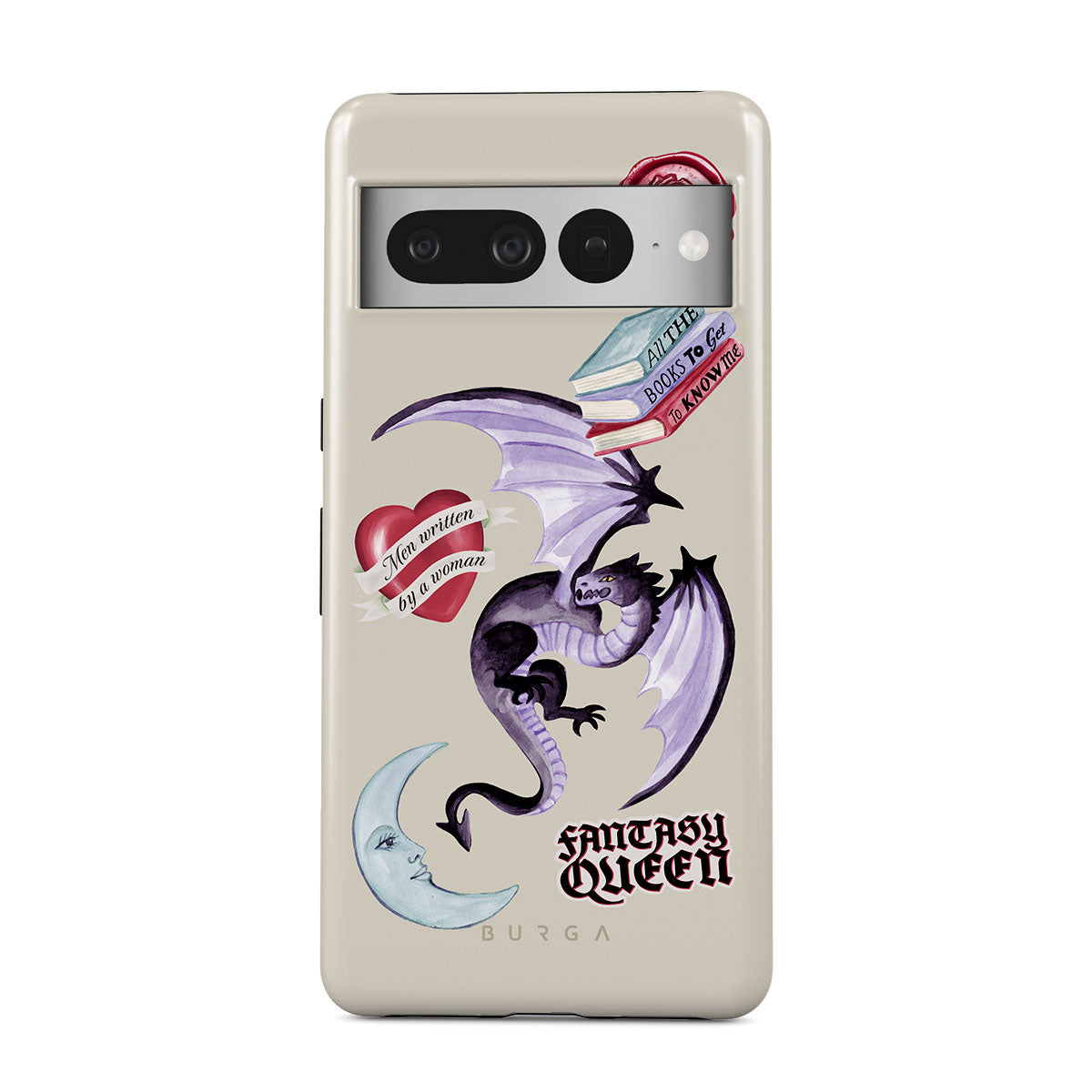 Questo design include: drago viola, sticker "Fantasy Queen", luna crescente, sigillo di cera viola, cuore con messaggio, libri.