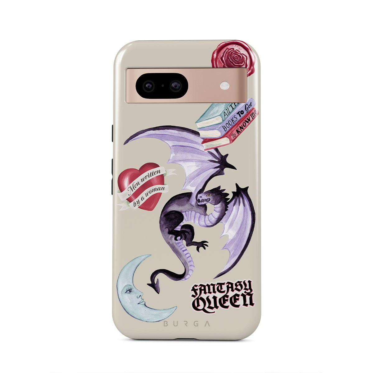 Questo design include: drago viola, sticker "Fantasy Queen", luna crescente, sigillo di cera viola, cuore con messaggio, libri.
