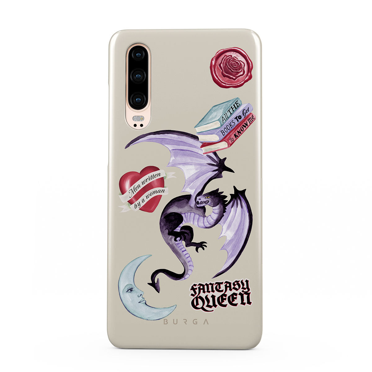 Questo design include: drago viola, sticker "Fantasy Queen", luna crescente, sigillo di cera viola, cuore con messaggio, libri.