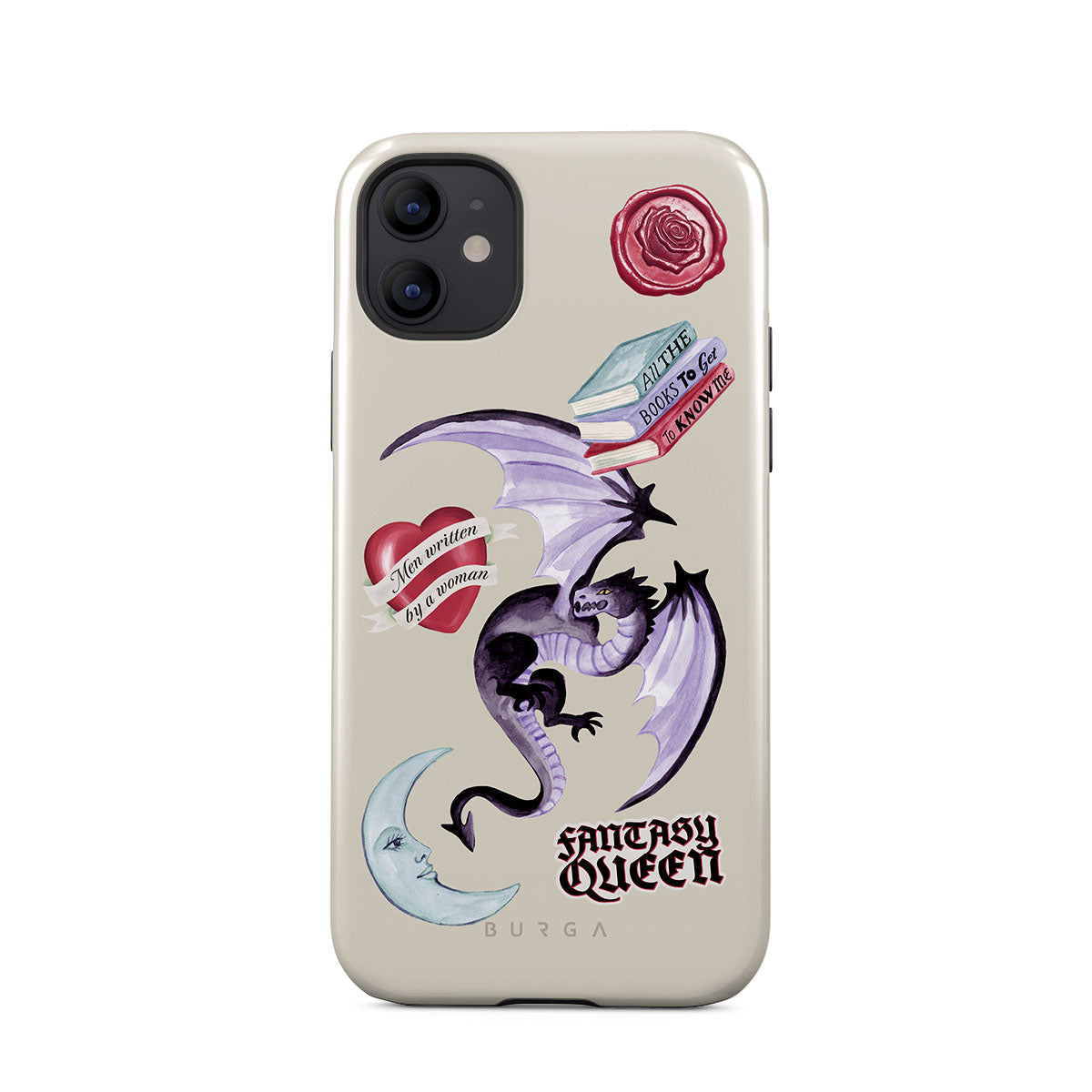 Questo design include: drago viola, sticker "Fantasy Queen", luna crescente, sigillo di cera viola, cuore con messaggio, libri.