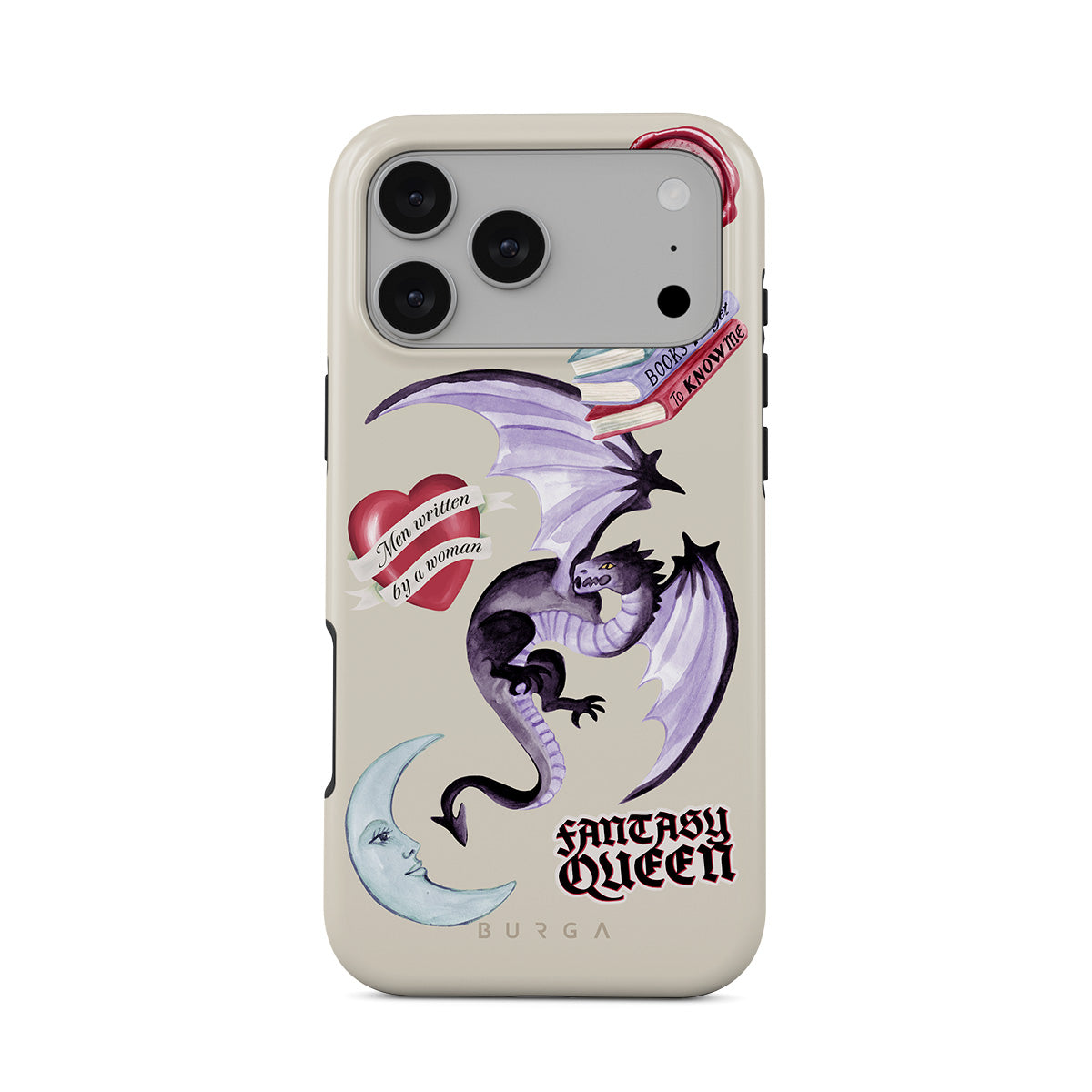 Questo design include: drago viola, sticker "Fantasy Queen", luna crescente, sigillo di cera viola, cuore con messaggio, libri.