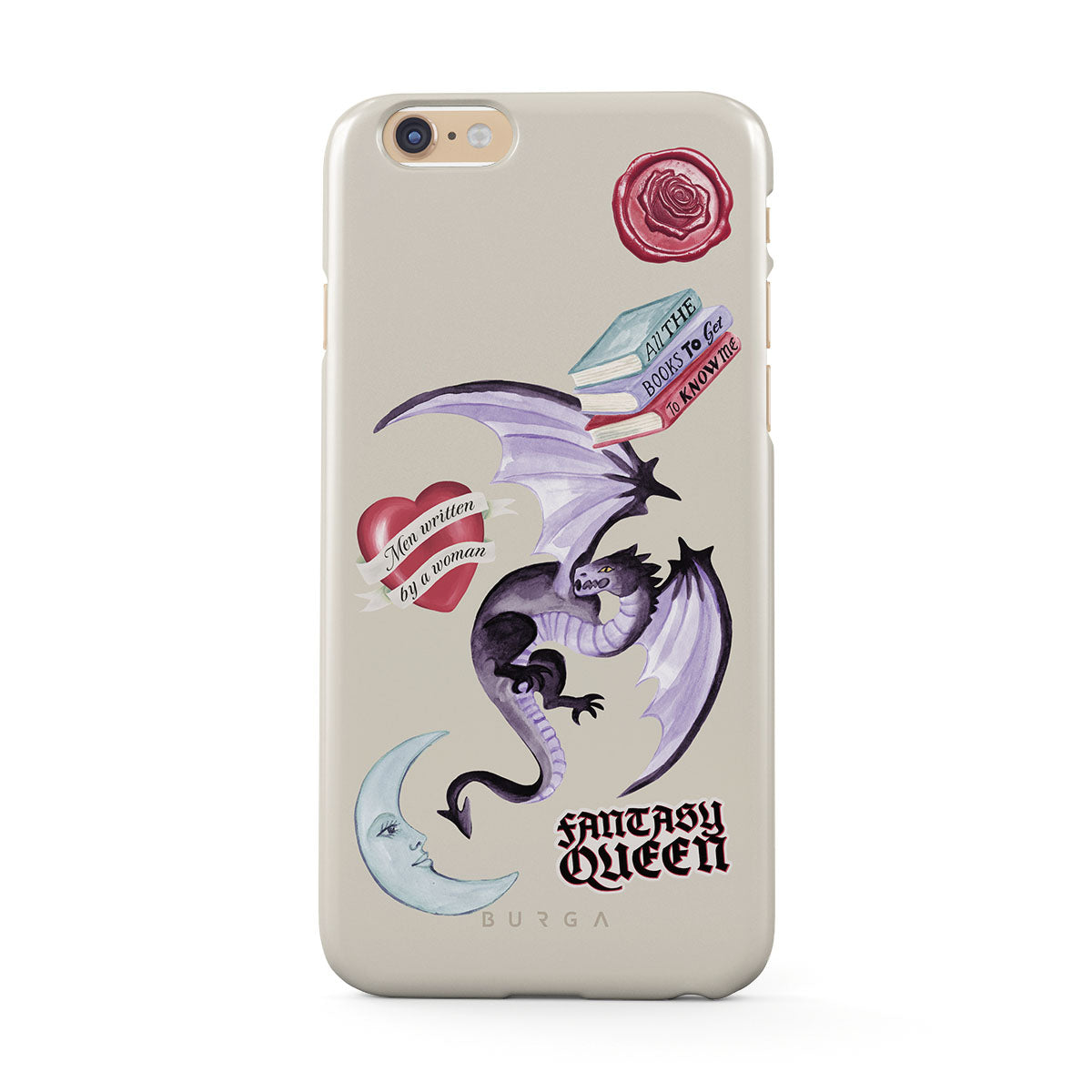 Questo design include: drago viola, sticker "Fantasy Queen", luna crescente, sigillo di cera viola, cuore con messaggio, libri.