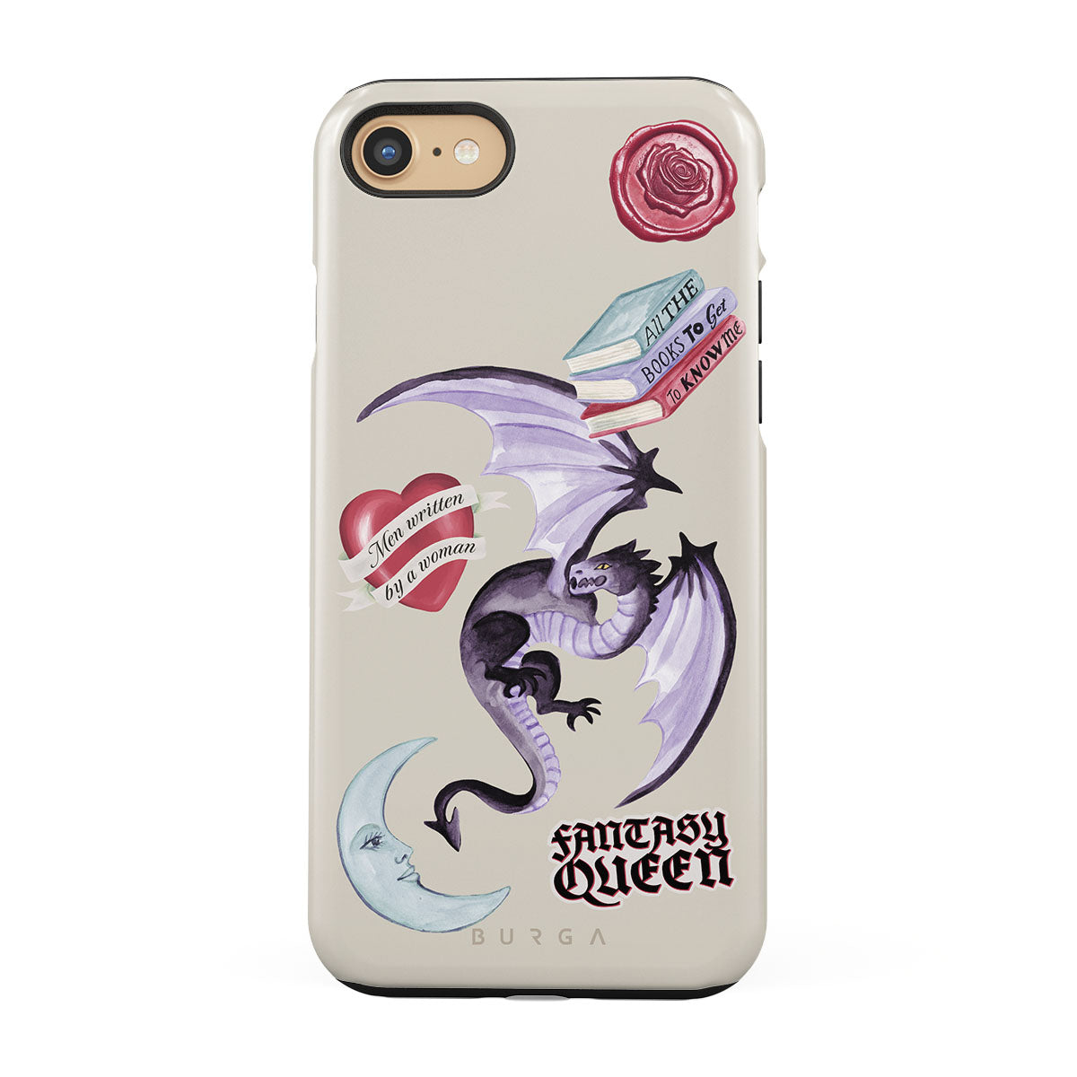 Questo design include: drago viola, sticker "Fantasy Queen", luna crescente, sigillo di cera viola, cuore con messaggio, libri.