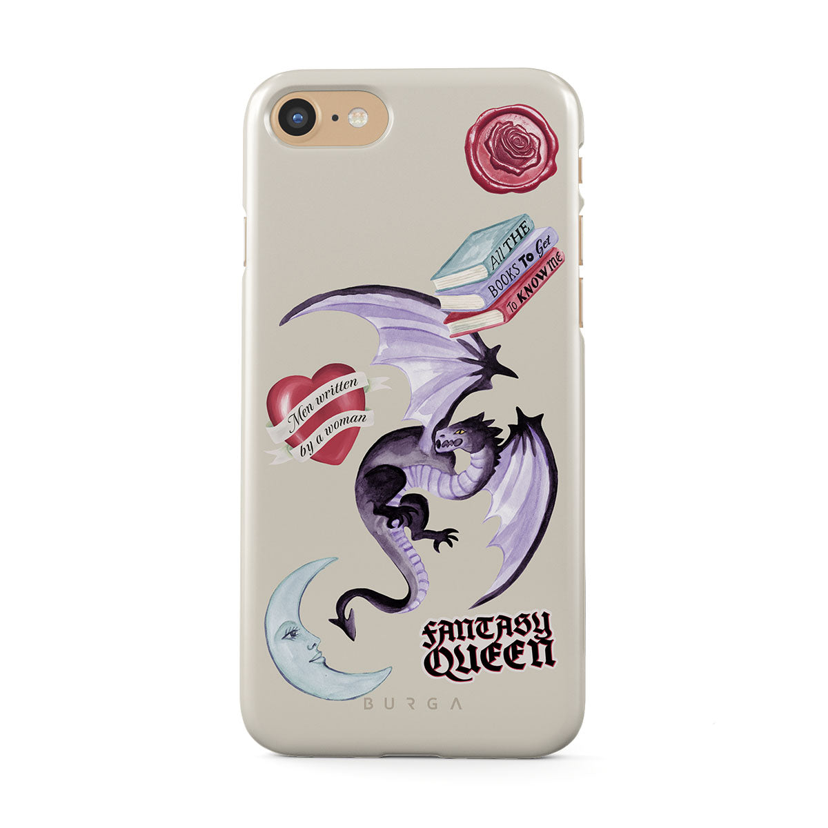 Questo design include: drago viola, sticker "Fantasy Queen", luna crescente, sigillo di cera viola, cuore con messaggio, libri.