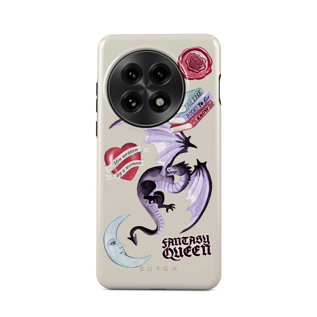 Questo design include: drago viola, sticker "Fantasy Queen", luna crescente, sigillo di cera viola, cuore con messaggio, libri.