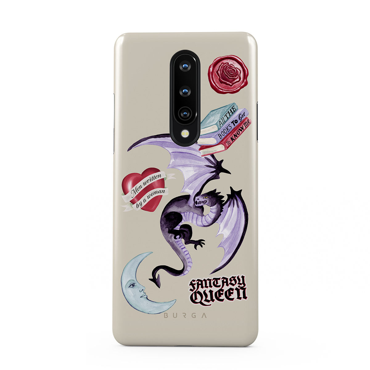 Questo design include: drago viola, sticker "Fantasy Queen", luna crescente, sigillo di cera viola, cuore con messaggio, libri.